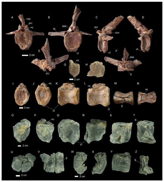 Cervical vertebrae: The cervical region is represented by four complete vertebrae: MAP-8494, MAP-8501, MAP-8518, and MAP-8519 (Figure 4; Supplementary Data, File S1). They have a certain degree of dorsoventral distortion. All centra are opisthocoelous (e.g., Figure 4A,S) and longer than wide and high (e.g., Figure 4C,I; Supplementary Data, File S1). The anterior and posterior articular facets are wider than high and sub-elliptical to heart-shaped (e.g., Figure 4A,H,S). The lateral surfaces are craniocaudally concave and dorsoventrally convex. The ventral surface displays a longitudinal keel, which widens in more posterior centra, such as in MAP-8494 (Figure 4X). The parapophyses are robust, tubular, and have an elliptical cross-section. They are in the anteromedian region of the lateral surfaces (e.g., Figure 4I,O).