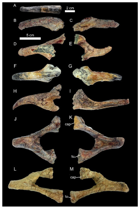 Cervical ribs of the I. galvensis specimen from the SC-4 site (Galve, Teruel, Spain). (A), MAP-6889 and MAP-6893. (B,C), MAP-8518. (D,E), MAP-8503. (F,G), MAP-.8507. (H,I), MAP-8502. (J,K), MAP-8519. (L,M), MAP-8514. Views: cranial (A,B,D,F,H,J,L) and caudal (C,E,G,I,K,M). Abbreviations: cap, capitulum; tu, tuberculum.
