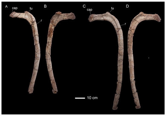 Dorsal ribs of the I. galvensis specimen from the SC-4 site (Galve, Teruel, Spain). (A,B), MAP-8496. (C,D), MAP-8497. Views: cranial (A,C) and caudal (B,D). Abbreviations: cap, capitulum; r, ridge; tu, tuberculum.
