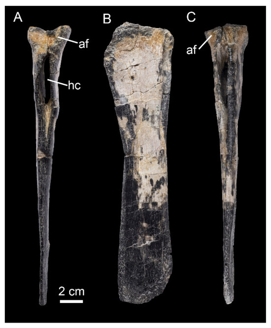 An anterior chevron MAP-8516 of the I. galvensis specimen from the SC-4 site (Galve, Teruel, Spain). Views: cranial (A), left lateral (B), and caudal (C). Abbreviations: af, articular facet; hc, haemal canal.