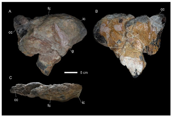 A proximal epiphysis MAP-8521 of the left tibia of the I. galvensis specimen from the SC-4 site (Galve, Teruel, Spain). Views: lateral (A), medial (B), and proximal (C). Abbreviations: cc, cnemial crest; fc, fibular condyle; ic, inner condyle; g, intercondylar groove.