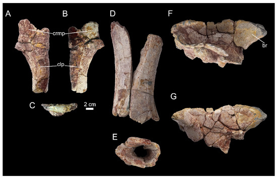 Dubious material of the I. galvensis specimen from the SC-4 site (Galve, Teruel, Spain). (A–C), Right sternal (?) MAP-8520. (D,E), Diaphysis MAP-8504 of a tibia (?). (F,G), Fragment of a plate of an ilium (?) MAP-8505. Views: lateral (A,D,F), medial (B,G), and proximal (C,E). Abbreviations: br, brevis shelf; clp, caudolateral process; crmp, craniomedial plate.