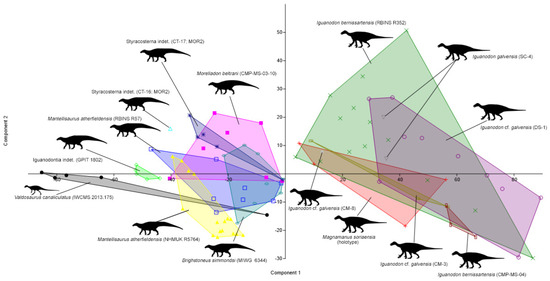 Scatter plot of the PCA of some iguanodontian dorsal vertebrae. Silhouettes were obtained from www.phylopic.org for Mantellisaurus, from [73] for I. bernissartensis, and modified from the reconstruction of Hypsilophodon made by [73] for Valdosaurus.