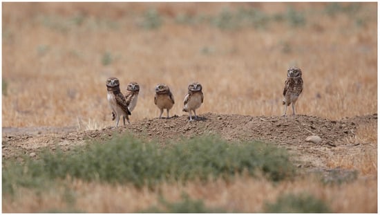 - Henderson, L.A.; Trulio, L.A. Can California ground squirrels reduce predation risk to burrowing owls? J. Raptor Res. 2019, 53, 172–179. [Google Scholar] [CrossRef]