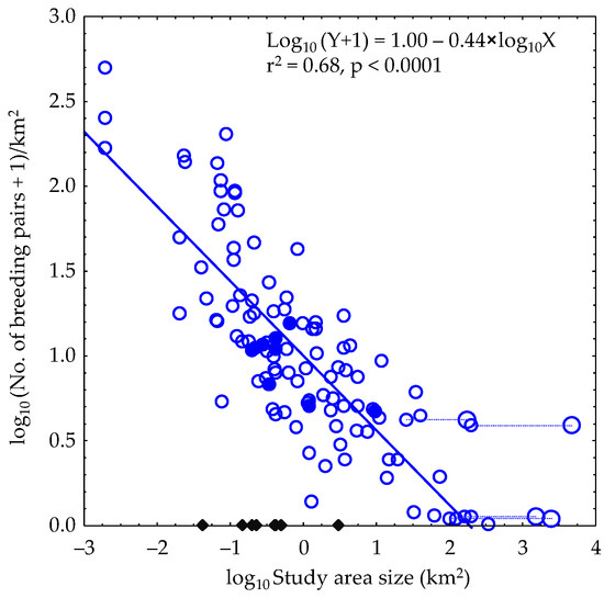 To interpret the number of breeding pairs of burrowing owls at NAS Lemoore, we compared numerical estimates of burrowing owls to the sizes of study areas used to make density estimates (Appendix A). We regressed log10 density on log10 study area size using linear regression analysis to account for the variation in density estimates due to study area size [16,35,36].