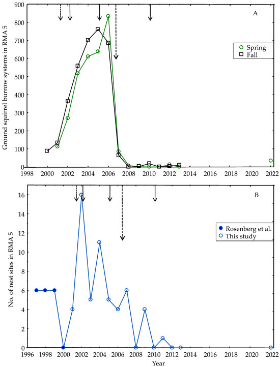 Counts of ground squirrel burrow systems 2000–2013 (A) and number of breeding pairs of burrowing owls 1997–2022 before [11] and during our study (B) in 43 ha RMA 5, Naval Air Station, Lemoore, California. Short dashed arrow indicates time of mechanical vegetation removal, solid arrows indicate controlled burns, and long dashed arrow indicates onset of severe drought.