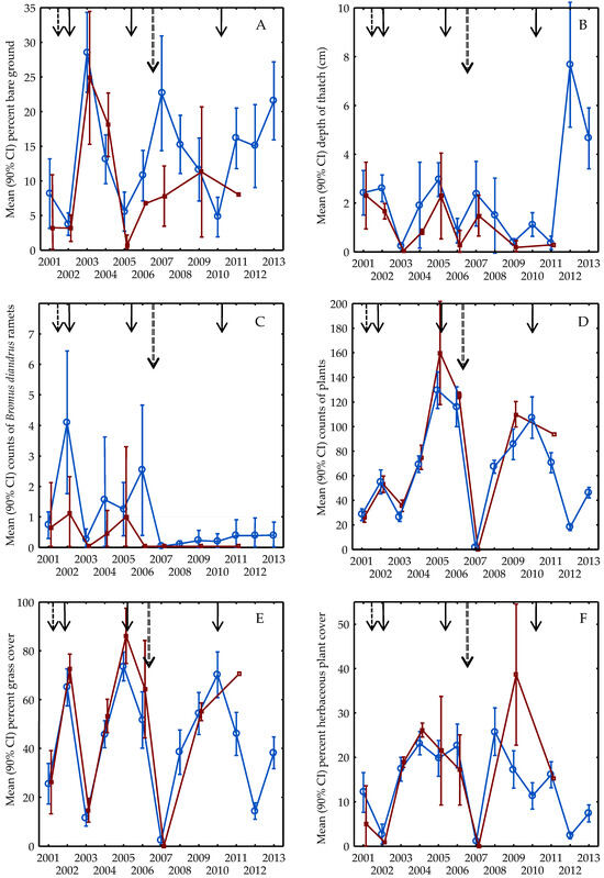 Yearly mean percent bare ground (A), depth of thatch (B), counts of ripgut brome ramets (C), counts of all plant ramets (D), percent grass cover (E), and percent herbaceous plant cover (F) at all 21 monitoring stations (blue circles and lines) and stations closest to burrowing owl nest burrows (maroon squares and lines) in 2001–2013 in RMA 5, Naval Air Station, Lemoore, California, where the short dashed arrow denotes mechanical removals of vegetation, short solid arrows denote controlled burns, and long dashed arrow denotes the onset of a severe drought.