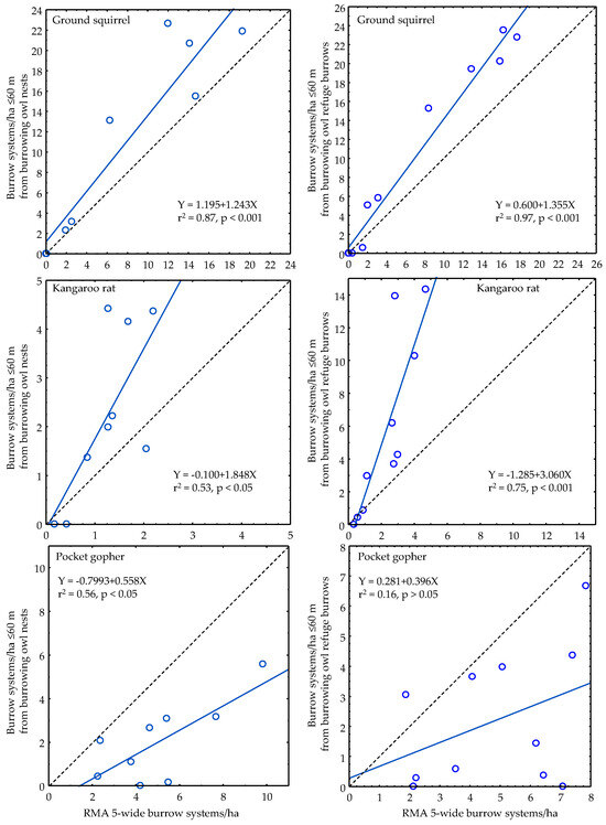 Annual mean burrow systems/ha within 60 m of burrowing owl nest burrows (left graphs) and non-breeding-season burrows (right graphs) regressed in RMA-5 wide burrow system density for ground squirrel (top graphs), San Joaquin kangaroo rat (middle graphs), and pocket gopher (bottom graphs) in 2000–2013, Naval Air Station, Lemoore, California. Dashed lines represent what would be equal densities between burrows counted within 60 m of burrowing owl burrows and within the entirety of RMA 5.