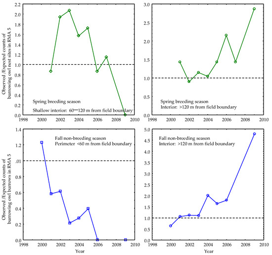 Within RMA 4, we detected five nest sites in 2003, and all were >60 m from the field’s perimeter. The 55 nest sites we recorded in RMA 5 from 2001 to 2013 were associated significantly with the location in the field (χ2 = 15.25, d.f. = 2, p < 0.005), with nest sites occurring at distances of <60 m, 60–120 m, and >120 m to RMA 5’s perimeter 0.30 times, 1.44 times, and 1.36 times more than expected, respectively. The 103 non-breeding-season burrows in 2000 through 2013 were associated significantly with location in RMA 5 (χ2 = 21.04, d.f. = 2, p < 0.005), with occupied burrows occurring within <60 m, 60–120 m, and >120 m of RMA 5’s perimeter 0.40 times, 1.27 times, and 1.39 times more than expected, respectively. Through all years, nest sites <60 m from RMA 5’s perimeter numbered fewer than expected based on the sizes of the areas which were compared. Meanwhile, the ratio of the observed to the expected number of nest sites declined within 60–120 m of RMA 5’s perimeter and increased >120 m from RMA 5’s perimeter (Figure 8). The ratio of observed to expected non-breeding-season burrows declined <60 m from RMA 5’s perimeter and increased >120 m from RMA 5’s perimeter (Figure 8).