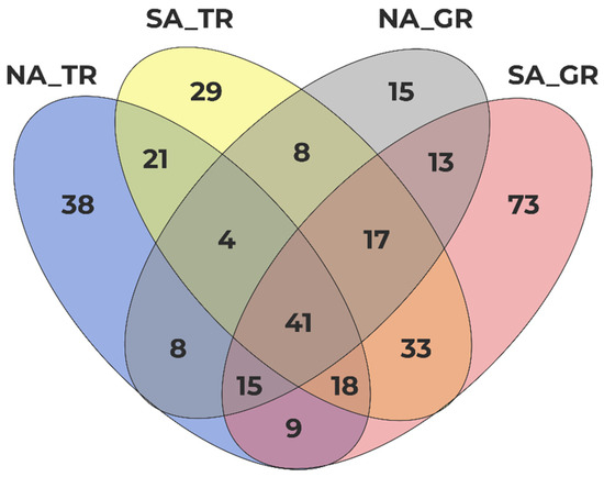 Number of species that are unique to or shared between the four Aegean subregions. Each intersection in the Venn diagrams represents the number of species contained only within the specific combination of geographic areas and nowhere else. NA_TR = North Aegean Türkiye; SA_TR = South Aegean Türkiye; NA_GR = North Aegean Greece; SA_GR = South Aegean Greece.