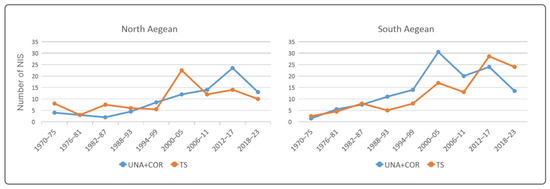Trends in transport stowaway (TS) and Lessepsian immigrants (UNA + COR) associated new NIS introductions per six-year cycle since 1970 in the North Aegean (left) and the South Aegean Sea (right).