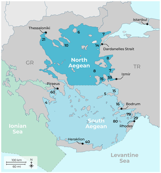 In our study, as a rule, the borders of the Aegean were delimited according to Jensen and Panagiotidis [66], who have harmonized them with existing boundaries established under the Regional Sea Conventions, the biogeographic boundaries established under the Habitats Directive and the boundaries of marine waters reported by EU Member States, but modified to include non-EU waters (Figure 1). Northwards, the Aegean Sea is separated from the Black Sea by a line connecting the Mehmetcik and Kumkale lighthouses in the Dardanelles Strait [64]. This definition is also in line with the Barcelona Convention, which was adopted in 1976 and entered into force in 1978. For the west borders of the Aegean with the Ionian Sea, we followed the boundaries of the Greek Ministry of Environment and Energy [69]. Similarly, we followed the boundaries of the Aegean with the Levantine up to the port of the island of Rhodes [69], but these were freely extended to the Turkish coasts up to Dalaman River’s estuary.