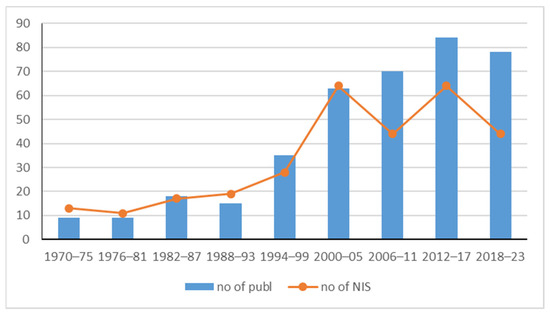 Scientific effort (number of publications as proxy) vs number of new NIS reported in the Aegean Sea per six-year cycle since 1970.