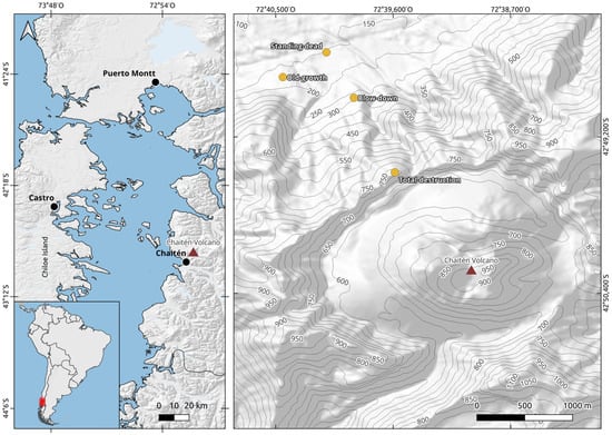 In May 2008, the last eruption of the Chaitén Volcano (42°50′ S) started near the small town of Chaitén in southern Chile (Figure 1, left panel). This eruption was the largest rhyolite eruption since the great eruption of Katmai Volcano in 1912 and the first rhyolite eruption for which some attributes of its dynamics and impacts were monitored [28]. The eruption consisted of an approximately 2-week-long explosive phase that generated as much as 1 km3 bulk volume tephra (~0.3 km3 dense rock equivalent), followed by an approximately 20-month-long effusive phase during which 0.8 km3 of high-silica rhyolite lava erupted, forming a new dome within the volcano’s caldera [28]. Chaiten Volcano was surrounded by extensive old-growth forests undisturbed by humans, providing a unique opportunity to evaluate the effects of volcanism over an undisturbed landscape.