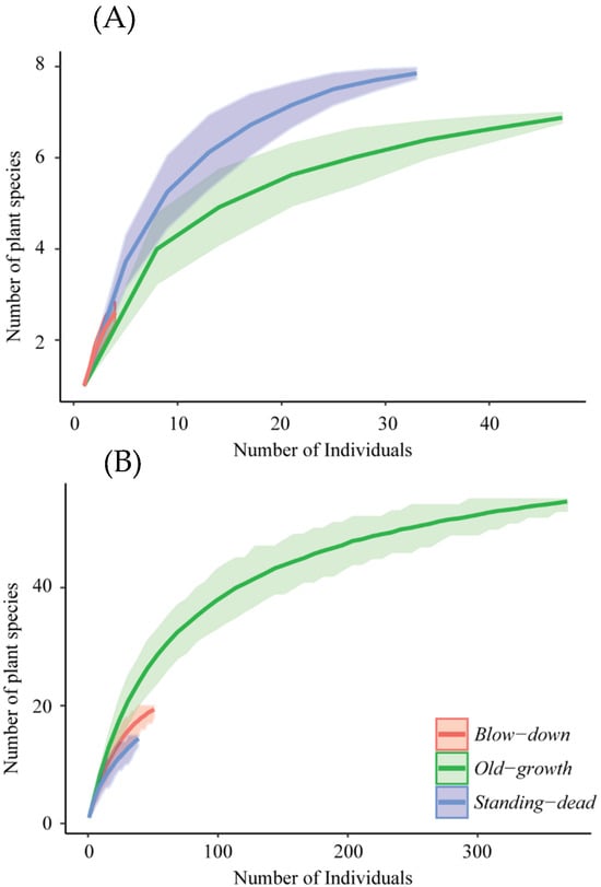 Rarefaction analysis shows the relationship between the number of tree seedling species (A) and small vascular plant species (B) as a function of the number of individuals. In both panels, the shaded area indicates one standard error. All sites affected by the eruption of Chaitén old-growth, standing-dead, and blow-down plots are compared, except for the total-destruction plot, which was not included because of the absence of plants.