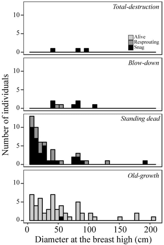The forest structure of the old-growth site showed individuals of all sizes, with several large emergent trees (Figure 4). Most trees in the old-growth plot were alive, and the snags most probably represent trees that died before the eruption, while in the other plots, most trees were killed by the eruption. The standing-dead plot showed a similar dbh distribution to the old-growth plot, with a higher frequency of small dbh. The blow-down plot showed a very small number of standing trees, concentrated in the intermediate size class, while the total-destruction plot practically had no individual standing trees (Figure 4).