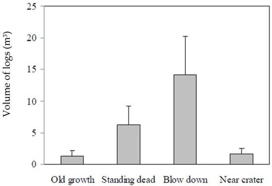 Volume of fallen dead trees (logs) in the study sites influenced by the eruption of Chaitén Volcano in the study sites.