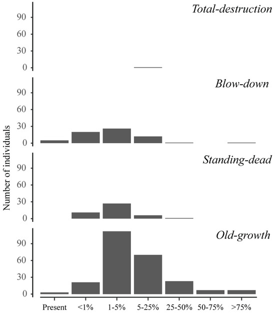 Other small plant species in the plots studied (Table 1) showed differences along the disturbance gradient (Table 2). For example, the old-growth plot has species in all categories of plant cover, with few species covering over 75% of the ground and many species covering between 1–5% (Figure 6). In contrast, standing-dead and blow-down plots were covered by fewer species and concentrated in the lower ranges of coverage (Figure 6). In the total-destruction plot, we only found a non-vascular plant (Marchantia sp.) with a cover between 5–25% (Figure 6) growing on a log exposed to the surface. The dominant understory species in the old-growth forest were the bamboo Chusquea spp. and the fern L. quadripinnata. These species were also present in the standing-dead and blow-down plots, although they were scattered and with a low percent of coverage in the disturbed plots.