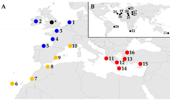 Regions from which non-native marine species lists were used in the present study, modified from the R package ggplot2 [47]. (A) Regions used for the in-depth analyses, grouped into three areas: Blue, Northeastern Atlantic; Yellow, Eastern Atlantic and Western Mediterranean; Red, Eastern Mediterranean. These regions consist of (1) the Netherlands [21]; (2) the Republic of Ireland [22]; (3) and (4) France, the Channel Coast, and the Bay of Biscay [23]; (5) and (6) Spain, the Bay of Biscay, and Macaronesia [24]; (7) and (8) Morocco, Atlantic, and the Mediterranean [25]; (9) Spain and the Mediterranean [24]; (10) France and the Mediterranean [23]; (11), (12), and (14) Greece, the Adriatic and Ionian Seas, the Aegean Sea, and the Levantine Sea [26]; (13), (15), and (16) Türkiye, the Aegean Sea, the Levantine Sea, and the Sea of Marmara [27]. The black circle * represents the terrestrial plants in the UK, which were used for setting the Tens Rule Theory [15,16,17,18]. (B) Regions which did not meet the criteria for the in-depth analyses and were only used for calculating establishment percentages. They are numbered by decreasing establishment percentage (see Section 3.1): (17) Türkiye and the Black Sea [27]; (18) Madeira [28]; (19) Portugal [28]; (20) the Mediterranean Sea [14]; (21) the Baltic Sea [29]; (22) South Africa [11]; (23) New Zealand [30]; (24) Azores [28]; (25) Libya [31]; (26) Brazil [32]; and (27) Cyprus [33].