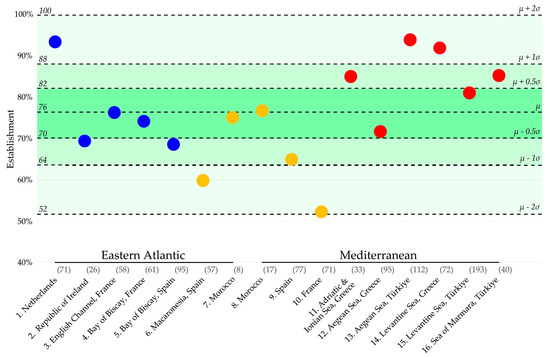 In countries like France, where establishment percentages are notably lower, there exists no ongoing comprehensive monitoring program that consistently revisits potential areas for species to establish [23]. This may, to some degree, explain the lowest establishment percentage in our study, i.e., 52.1% along the Mediterranean coast of France (Region 10 in Table 1). Additionally, this low rate can be attributed to how easily non-native species from the temperate NE Atlantic and the subtropical Eastern Mediterranean areas can be introduced there. This can, for example, happen up to a certain degree through natural distribution or with the help of recreational shipping from either direction [23,33]. However, these species coming from neighboring areas may face difficulties in adapting and thriving in the region due to water temperatures that can be either too hot or too cold for them to establish.