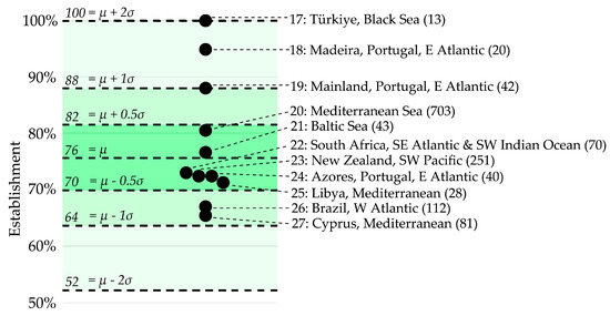 Figure 2 highlights the 16 regions in the NE Atlantic or Mediterranean for which datasets were found that documented all newly recorded non-native marine species over the past three decades, i.e., from 1991 to 2020. These establishment percentages ranged from 52.1% to 93.8%. In between these minimum and maximum values, the percentages followed a normal distribution (Shapiro–Wilk, p = 0.928) (Figure 2). On average, 76.0% (n = 16; σ = 11.8%) of the species that were recorded as new in a region managed to establish themselves. Although most establishment percentages were found to be within one standard deviation of this average, there were five outliers that had larger deviations (Figure 2). Two of the most extreme outliers concern the Netherlands, with a relatively high establishment percentage of 93.0%, and the Mediterranean coast of France, with the lowest establishment percentage, i.e., 52.1% (Figure 2 and Table S6).