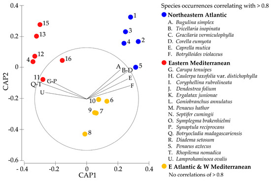 Canonical Analysis of Principal coordinates (CAP) based on the Sørensen distances between established species assemblages found in sixteen regions, subjectively grouped into three areas, i.e., the NE Atlantic (blue), E Atlantic and W Mediterranean (yellow), and E Mediterranean (red). These areas, along with the corresponding region numbers next to the dots, match those in Figure 1. The overlaid vector function of PRIMER-e was used to illustrate correlating species occurrences with a Pearson correlation coefficient of >0.8. The species representing the capital letters are clarified on the right, below the area they appear to be related to. The length of the vector line reflects the strength of the correlation, with the circle representing the maximum correlation of 1.