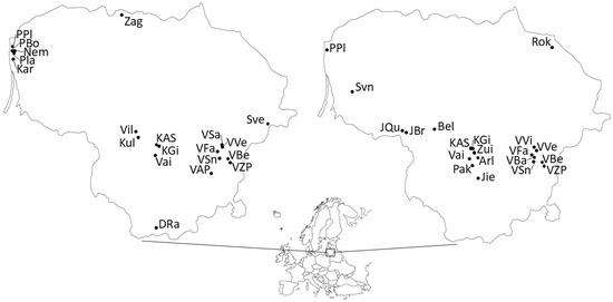 Location of Lithuanian populations (names and name abbreviations) of I. parviflora (left) and I. glandulifera (right). Note: Rok—Rokiškis; VVi—Vilnius-Visoriai; VSn—Vilnius-Šnipiškės; VFa—Vilnius-Fabijoniškės; VBa—Vilnius-Baltupiai; VBe—Vilnius-Belmontas; VVe—Vilnius-Verkiai; VSa—Vilnius-Santariškės; VAP—Vilnius-A. Paneriai; VZP—Vilnius-Ž. Pavilnys; Svn—Švenčionys; DRa—Druskininkai-Ratnyčia; KAS—Kaunas-A. Šančiai; Vai—Vaišvydava; KGi—Kaunas-Giraitė; Zui—Kaunas-Zuikinė; Jie—Jieznas; Pak—Pakuonis; Arl—Arlaviškės; Kul—Kulautuva; Vil—Vilkija; Bel—Belvederis; JBr—Jurbarkas-Bridge; JQu—Jurbarkas-Quarry; Sve—Švėkšna; Kar—Karklė; Nem—Nemirsėta; PBo—Palanga-Botanical garden; PPl—Palanga; Pla—Plazė; Zag—Žagarė.