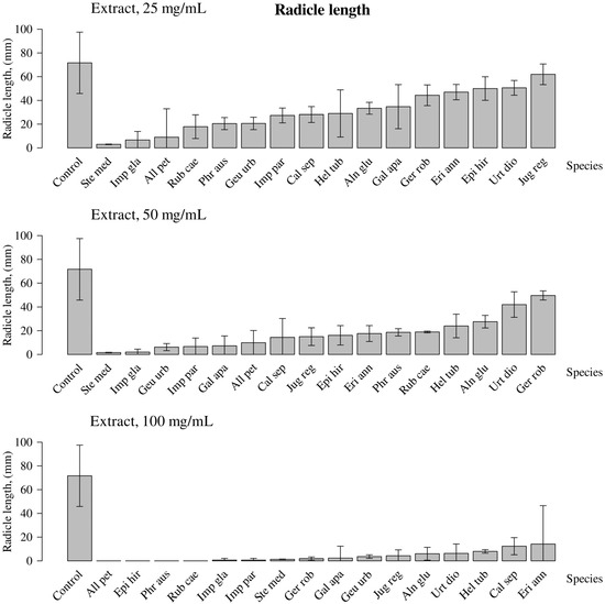 Radicle length (mm) of Lepidium sativum seedlings grown in the different concentration aqueous extracts of the leaves of selected plant species. Columns indicate mean values, and whiskers indicate intervals of confidence.