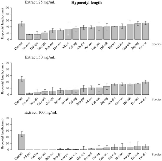 Hypocotyl length (mm) of Lepidium sativum seedlings grown in different concentration aqueous extracts of the leaves of selected plant species. Columns indicate mean values, and whiskers indicate intervals of confidence.