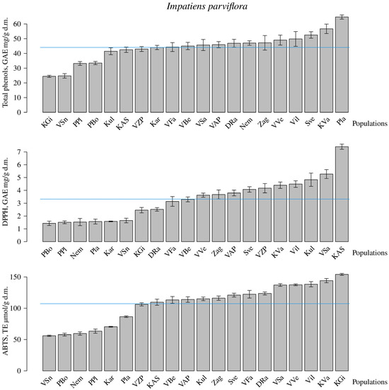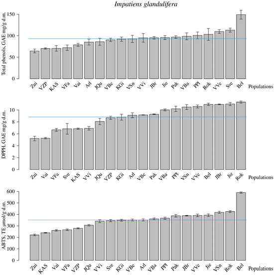 Content of the total phenols (GAE mg/g d. m.), 2,2-Diphenyl-1-picrylhydrazyl (DPPH•) radical scavenging activity (GAE mg/g d. m.), and 2,20-azinobis-(3-ethyl-benzothiazoline-6-sulfonic acid) ABTS•+ radical scavenging activity (TE μmol/g d. m.) in the ethanolic extracts of the leaves of Impatiens glandulifera populations. Columns indicate mean values, and whiskers indicate intervals of confidence.