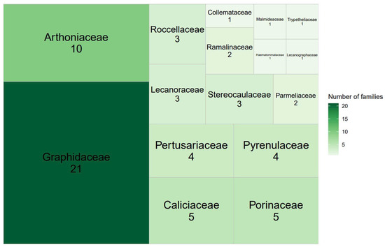 The study results also highlighted that there were five families with only 1 species, two families with 2 species, seven families with 3–5 species, one family with 10 species, and one family with 21 species. The family with the highest number of lichen species was Graphidaceae (21 species), followed by Arthoniaceae (10 species) and Caliciaceae and Porinaceae (5 species) (Figure 3).