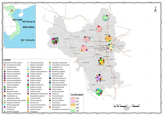 Hanoi is the capital of Vietnam, with a total area of 3359.82 km2 and a population of about 8.4 million people. This is one of the most developed cities in Vietnam, with an urbanization rate of 60%. In this study, we investigated how developed and urbanized areas may influence lichen diversity in Hanoi. The lichen community from Hanoi was studied using three tree stands from each of five landscapes: natural vegetation, industrial parks, urban and rural areas, and roadsides. Lichen species and their cover abundance were recorded on tree trunks at heights from 30 to 150 cm above ground in ten host trees that were randomly selected for each replication. Sixty-seven lichen species, from sixteen families and eight orders, were recorded. Results showed urbanization and the development of industrial parks and transportation altered species composition, evidenced by a reduced number of lichen species. Natural forests sustained the highest lichen diversity measured. These results suggest that a greater diversity of lichen can be preserved in natural forests, if that natural vegetation is effectively managed and conserved.