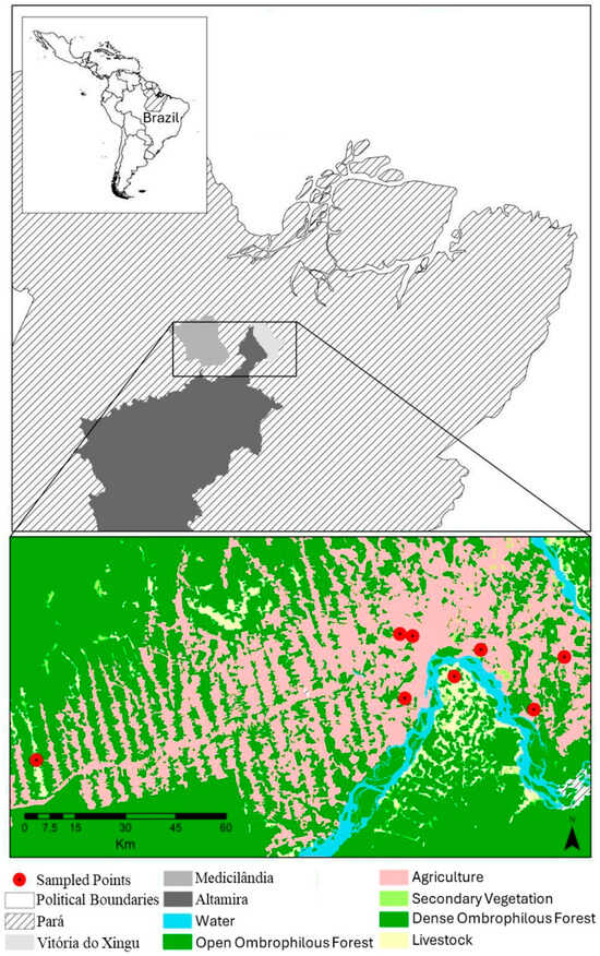 Since the 1970s, the state of Pará has experienced significant anthropogenic pressure, with the construction of the Trans-Amazonian Highway being a major driver of increased deforestation and fire incidence in the area [31]. The municipalities where sampling took place are situated within the “arc of deforestation”, a zone marked by intense land-use change and environmental degradation. Here, land use and cover are largely focused on vegetable and mineral extraction, agriculture, and livestock farming [32].