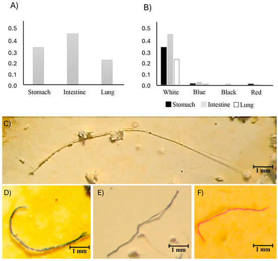 Percentage of fibers found (A) by organ and (B) categorized by color and by organ in hematophagous bats sampled during the period 2017 to 2021. White/Transparent (C), Blue (D), Black (E), and Red (F) Fiber.