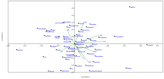Trait biplot diagram obtained using 9 studied traits and the panel population.