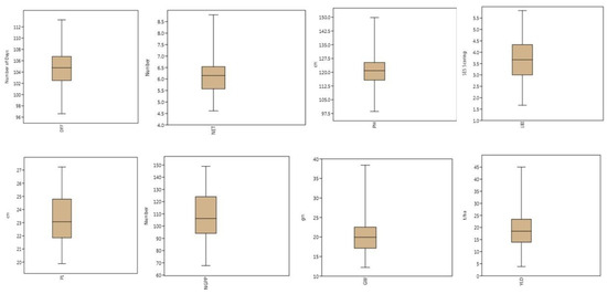 The population was classified into subgroups by Wards clustering approach. The subgroups accommodated genotypes based on the nine studied traits. The genotype–trait biplot diagram was constructed to represent the germplasm lines in the two dimensions based on the nine studied traits. The biplot diagram showed the distribution of the germplasm lines in all of the quadrants (Figure 1). In addition, from the box plot diagram (Figure 2) and biplot, adequate diversity was found in the study population for the marker–trait analysis.
