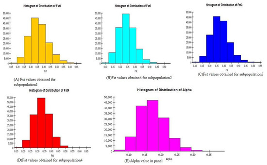 At K = 4, the analysis of molecular variance (AMOVA) revealed genetic differences among and within subpopulations. The genetic variance was 4% among individuals of populations and 95% among individuals in the four sub-populations at K = 4. The population exhibited a difference, as expected from Hardy–Weinberg’s prediction using Wright’s F statistic. The analysis of the four sub-populations showed average Fis and Fit values of 0.044 and 0.050 by using all 45 loci, respectively (Table 2). The Fst values obtained for the four subpopulations were different from each other (Figure 4). The alpha value obtained from the panel population was also very low. The mean Fst value was found to be 0.030. By using Fst values at K = 4, it was possible to distinguish between different subpopulations, showing differences among them.