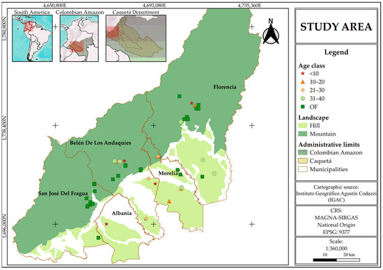 The study area is located in the department of Caquetá, in the northwestern Colombian Amazon, covering the municipalities of Florencia (1°36′50″ N; 75°36′46″ W), Morelia (1°29′09″ N; 75°43′28″ W), Belén de los Andaquíes (1°24′59.1″ N; 75°52′21.2″ W), San José del Fragua (1°19′52″ N; 75°58′28″ W), and Albania (1°19′44″ N; 75°52′42″ W) (Figure 1). The region’s climate is classified as humid tropical, with an average annual precipitation of 3235 mm, concentrated during a rainy season from March to June, and a mean temperature of 25° [30]. The predominant soils are Inceptisols and Oxisols, according to USDA classification, characterized by fine texture, drainage limitations, high acidity (pH ranging from 4.5 to 5.8), high aluminum saturation, and low base saturation. These soils have limited contents of carbon, phosphorus, potassium, and magnesium, affecting their fertility and aeration capacity [31].