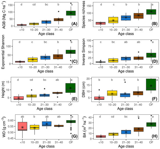 Changes in forest structural and diversity attributes across four age classes of secondary forests and in reference forest following the abandonment of cattle ranching. (A) Aboveground biomass stock (AGB); (B) tree species richness; (C) exponential Shannon diversity (ExpH); (D) inverse Simpson diversity (1/D); (E) mean tree height (Height); (F) diameter at breast height (DBH); (G) wood density (WD); and (H) basal area (BA). Different letters indicate significant differences among age classes (Fisher’s LSD test; p < 0.05).