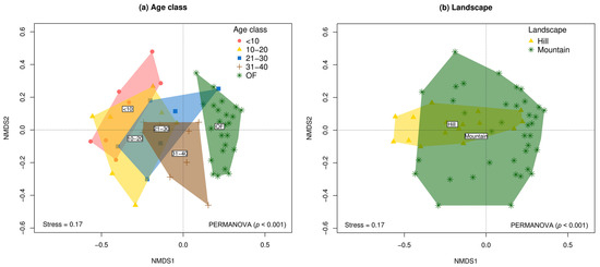 A non-metric multidimensional scaling (nMDS) analysis (50 iterations) was conducted based on the Chao–Jaccard similarity index to visualize species composition across different age classes and landscapes using the metaMDS function from the vegan package in R [52]. The accepted stress level was ≤0.2, following the criteria of Oberleitner et al. [53] and Chao et al. [54]. A Permutational Multivariate Analysis of Variance Using Distance Matrices (PERMANOVA) based on Chao–Jaccard distance and 9999 permutations was performed using the adonis2 function from the vegan package in R [52]. The pairwise.adonis function with 9999 permutations from the pairwiseAdonis package in R [55] was used to conduct pairwise multi-level comparisons of the studied effects.