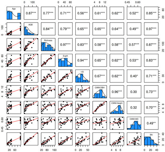 Pairwise correlation matrix among the key variables forest age (Age), aboveground biomass carbon (AGB), tree species richness (Richness), exponential Shannon diversity index (ExpH), Simpson’s diversity index (1/D), community-weighted mean diameter at breast height (CWM.DBH), community-weighted mean tree height (CWM.Height), community-weighted mean wood density (CWM.WD), and basal area (BA).
