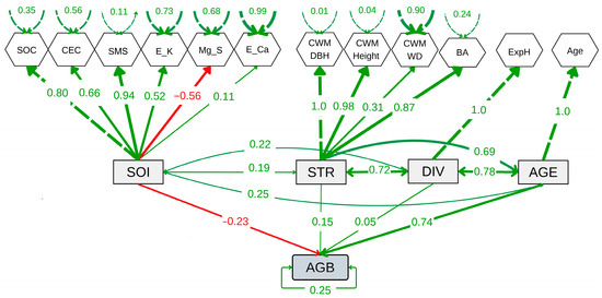 Structural equation model showing the relationships among aboveground biomass carbon (AGB), forest age (AGE), tree diversity (DIV), soil properties (SOI), and forest structure (STR). DIV, STR, and SOI are latent variables constructed from observed indicators such as the log-transformed exponential Shannon index (ExpH), log-transformed community-weighted mean diameter at breast height (CWM.DBH), log-transformed community-weighted mean tree height (CWM.Height), log-transformed community-weighted mean wood density (CWM.WD), log-transformed mean basal area (BA), log-transformed soil organic carbon (SOC), cation exchange capacity (CEC), soil moisture saturation (SMS), log-transformed exchangeable potassium (E_K), exchangeable magnesium (Mg_S), log-transformed exchangeable calcium (E_Ca), and log-transformed forest age (Age).