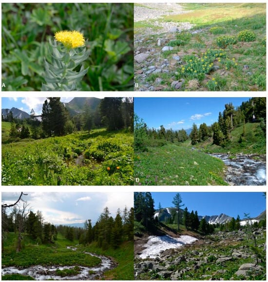 R. rosea populations in different ecological conditions (A–F) in Kazakhstan Altai (photo by Kubentayev, S.).