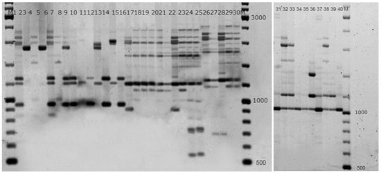 Electrophoretic analysis of iPBS profiling of R. rosea was conducted using PBS primer 2232. Population samples Pop 1 (1–10), Pop 2 (11–20), Pop 3 (21–30), and Pop 4 (31–40); M—Thermo Scientific GeneRuler DNA Ladder Mix (100–10,000 bp).