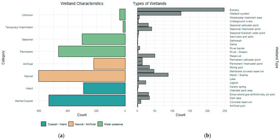 (a) Major categories of wetlands in the Aegean Archipelago islands, in absolute frequencies per case. (b) Absolute frequencies of wetland types in the Aegean Archipelago wetlands.