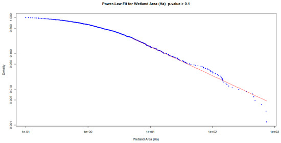 The power-law fitting demonstrated that the distribution of wetland sizes follows a natural heavy-tailed pattern, with smaller wetlands being much more frequent than larger ones [65,67]. This result supports the hypothesis that wetland areas are self-organizing and shaped by natural ecological processes, such as hydrological and geomorphological factors, rather than by artificial or random influences [70,71]. The fractal dimension of 0.189 further reinforces the idea that larger wetlands, while rare, play a critical role in the overall ecological dynamics [2,50]. The similarity to the power-law model (p-value = 0.416) supports the dataset’s validity, confirming that the observed distribution reflects naturally occurring processes and enhancing confidence in its reliability [61,72].
