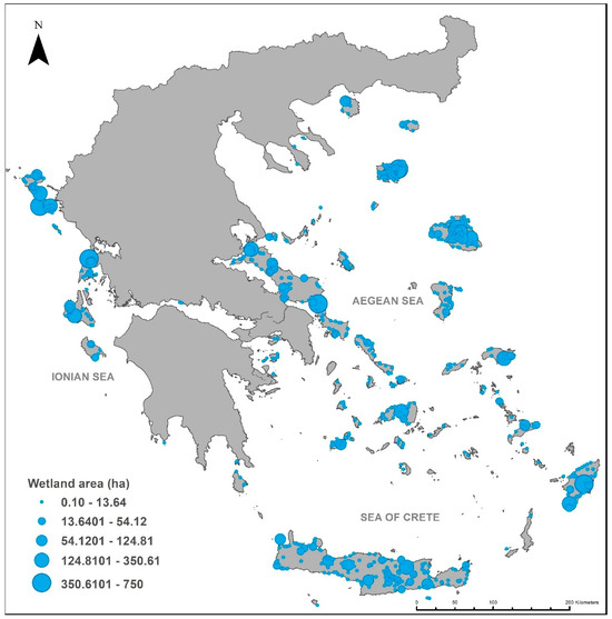 We utilize the public domain database Ygrotopio Islands developed by the WWF (https://www.ygrotopio.gr/general/search.php?lang=en&action=map&action=export#, accessed on 17 November 2024) [59], which contains data on 824 wetlands across 75 islands. These data have been part of a national inventory of Greek wetlands since 1980. The dataset includes 37 key characteristics that describe various aspects of each wetland. These characteristics encompass the nature of the wetland (e.g., natural or artificial), water presence (seasonal, permanent, temporary/intermittent, unknown), location (inland, marine/coastal), and the area in hectares, ranging from 0.1 to 750 hectares (see Appendix A). Additionally, wetlands were classified into specific types: sand bars, seasonal freshwater ponds, underground rivers, and estuarine systems. Prevalent vegetation types were also documented, including shrubby arborescent species, wet meadow grasses, and emergent aquatic plants. These data were georeferenced to latitude and longitude coordinates, allowing for precise mapping of wetland locations within the study area. Furthermore, the database outlines each wetland’s property and protection status, human activities, and intensity within each wetland, as well as its catchment area (percentage remaining untouched). The data can be accessed and linked through polygon pop-ups in WWF Greece’s mapping application. The profiles built using this comprehensive set of characteristics serve as the basis for subsequent analysis of how different anthropogenic pressures impact wetland types.