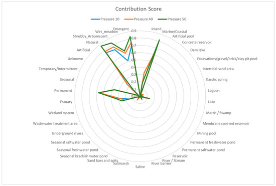 The naïve Bayes model demonstrated varying levels of predictive accuracy and reliability across the three types of anthropogenic pressures (see Table 2). It performed best with the more balanced datasets, specifically urbanization and transportation, where the class distribution allowed for a more equitable assessment of TRUE and FALSE cases. In contrast, the model for agricultural pressure, which was affected by class imbalance, achieved a high accuracy overall but struggled to detect the minority class. This highlights the importance of addressing dataset imbalances. Low kappa values across all pressures indicated that while the model could predict the majority class, its overall reliability was limited. This suggests a need for further refinement of the model. Contribution scores produced by the naïve Bayes model showcase little fluctuations between pressures, highlighting specific wetland characteristics throughout the three. The ε value, however, provides more variety across the pressures, highlighting several different wetland characteristics with high values.
