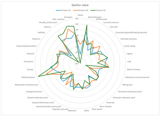 ε < 0: A negative epsilon value indicates a negative association between the wetland characteristic and pressure. This suggests that the pressure occurs less frequently than is expected in wetlands where the characteristic Ee is present. For instance, a negative epsilon value for inland wetlands concerning urbanization pressure may imply that these wetlands are relatively less impacted by urbanization compared to coastal wetlands.