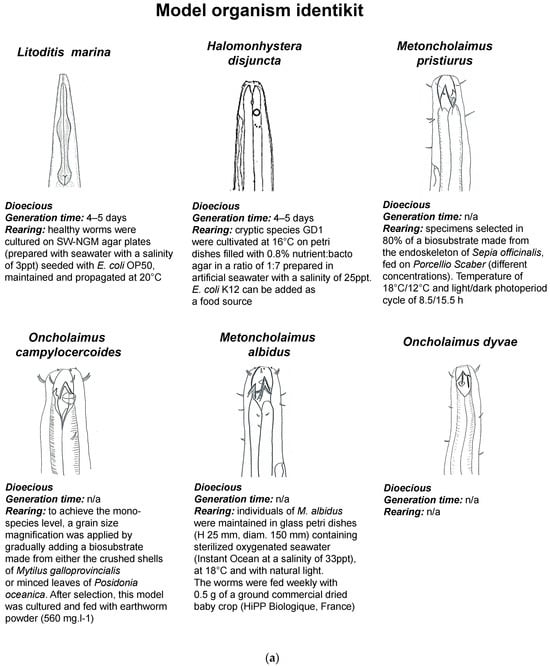 Identikit of some free-living marine nematodes considered suitable model organism candidates. (a) L. marina, H. disgiunta, M. pristiurus, O. campylocercoides, M. albidus, O. dyvae. (b) Diplolaimelloides spp. T. longicaudata, D. dieverngatensis, Stilbonematinae and Astomonematinae, E. brevis.